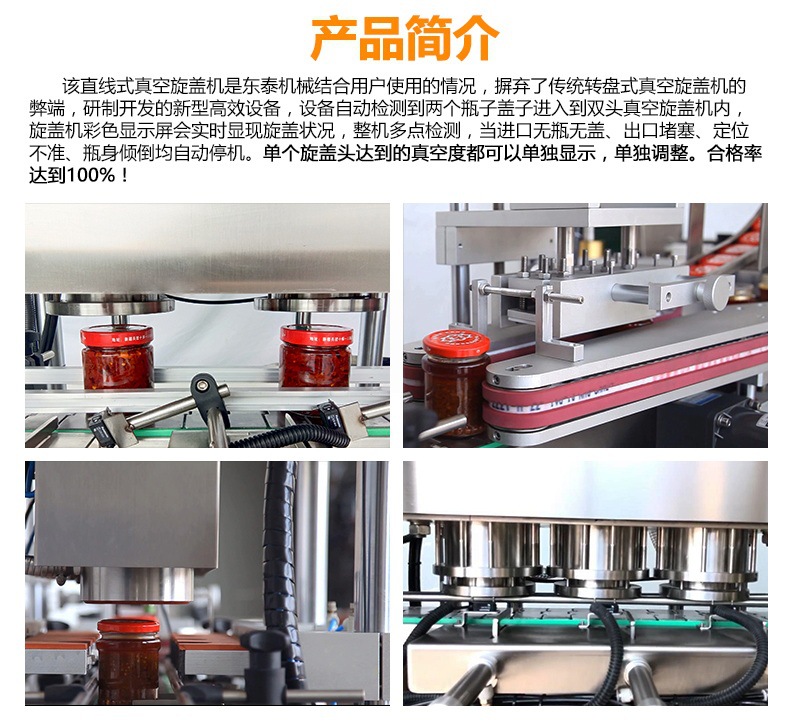 該直線式真空旋蓋機(jī)是東泰機(jī)械結(jié)合用戶使用情況,摒棄了傳統(tǒng)轉(zhuǎn)盤式真空旋蓋機(jī)的弊端,研制開發(fā)的新型高效設(shè)備,設(shè)備自動檢測到兩個瓶子蓋子進(jìn)入到雙頭真空旋蓋機(jī)內(nèi),旋蓋機(jī)彩色顯示屏?xí)?shí)時顯示旋蓋狀況,整機(jī)多點(diǎn)檢測,當(dāng)進(jìn)口無瓶無蓋、出口堵塞、定位不準(zhǔn)、瓶身傾倒均自動停機(jī)。單個旋蓋頭達(dá)到的真空度都可以單獨(dú)顯示,單獨(dú)調(diào)整。合格