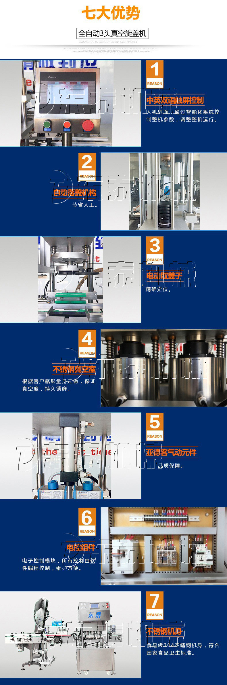 1.臺灣臺達(dá)PLC控制系統(tǒng),人機(jī)界面,基恩士檢測點(diǎn),國內(nèi)電氣配件。采用自動抽真空旋蓋于一體,自動化程度高;