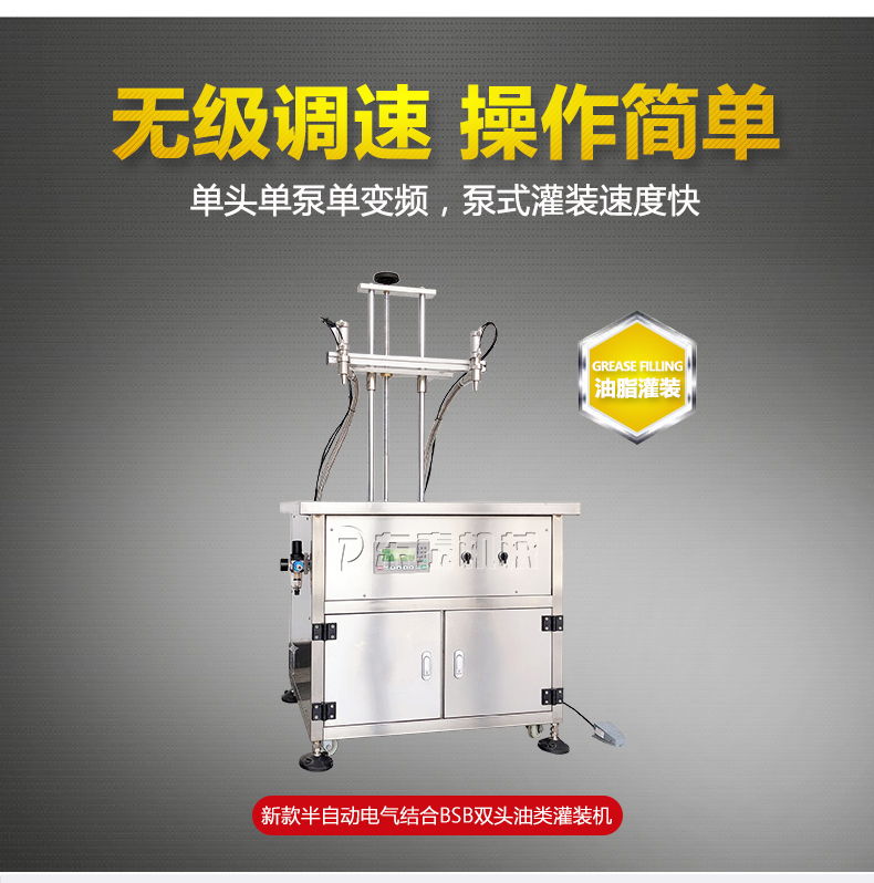 半自動雙頭食用油灌裝機主要是應(yīng)用于各種食用油、潤滑油等粘稠液體的定量灌裝,如花生油,大豆油,菜籽油、香油,潤滑油等油類的灌裝。還擁有這先進(jìn)的定量灌裝技術(shù),結(jié)合了微電子智能控制技術(shù)有著單頭單變頻控制系統(tǒng),實現(xiàn)高精度、無級調(diào)速,操作方便。兩個灌裝頭能夠在一定的范圍內(nèi)隨意調(diào)節(jié)間距和灌裝量,能夠使用多種大小形狀的容器的灌裝。自動化程度高。另外,半自動雙頭食用油灌裝機的機身零件選用的事優(yōu)質(zhì)不銹鋼,耐用又衛(wèi)生,長時間工作性能可靠穩(wěn)定。本公司產(chǎn)品通過了IS9000質(zhì)量體系認(rèn)證。設(shè)備經(jīng)久耐用,性能穩(wěn)定,是食用油、潤滑油等行業(yè)理想的灌裝設(shè)備。