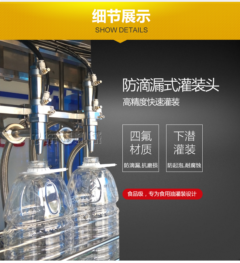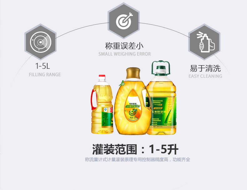 該系列食用油灌裝機采用流量計式計量灌裝原理,多項技術認證,適用于各種規(guī)格(1-5 升)的南瓜籽油、榛子油、牡丹籽油、芝麻油、核桃油、山茶油、亞麻籽油、棉籽油、橄欖油、大豆油、玉米油、菜籽油等食用油灌裝。設備采用高精度的旋轉(zhuǎn)編碼器計量,保證了 1‰的灌裝精度,在保證灌裝精度的同時,提高了20%-35%的灌裝速度,操作簡單,維護方便,節(jié)省人工成本,生產(chǎn)效率更高。