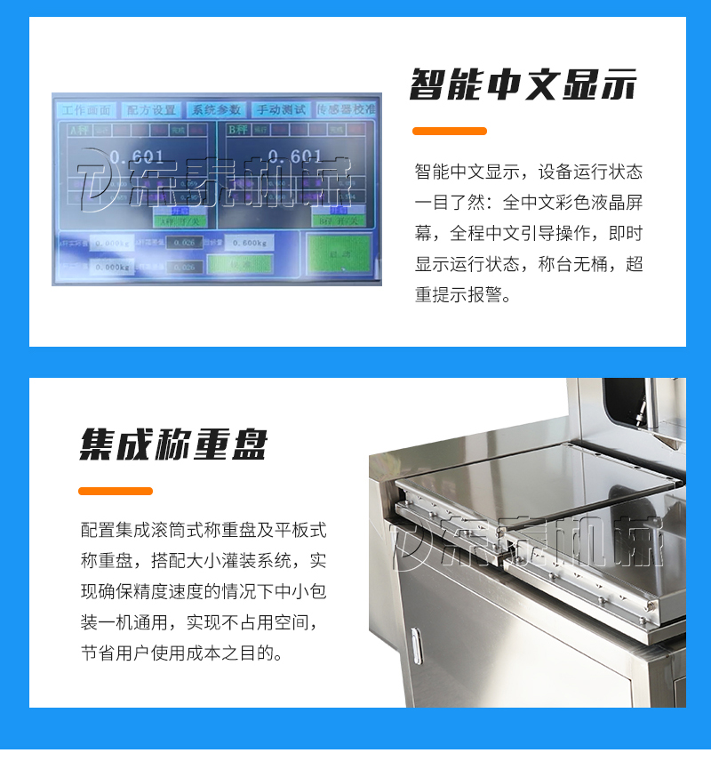 集成滾筒、平板稱重盤,一機多用,方便快捷:配置集成滾筒式稱重盤及平板式稱重盤,搭配大小灌裝系統,實現確保精度速度的情況下中小包裝一機通用,實現不占用空間,節省用戶使用成本之目的。